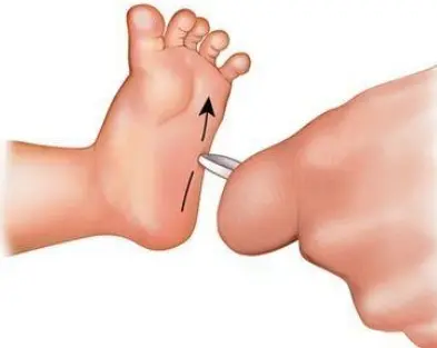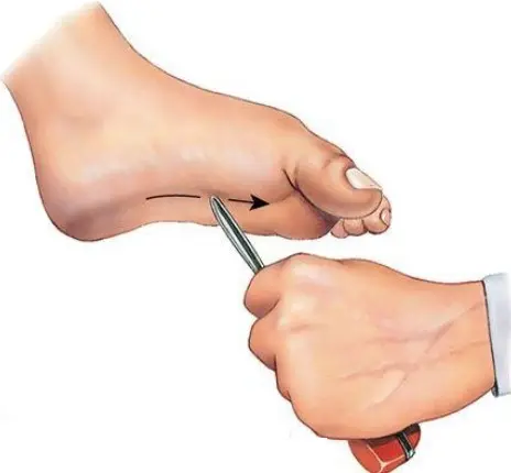 La jambe est légèrement fléchie sur la cuisse, le pied reposant sur le lit. La recherche se fera par excitation de la plante, partie externe, au moyen d'un objet mousse (non-piquant), que l'on promènera d'arrière en avant, du talon vers les orteils. Chez le sujet sain, les orteils se fléchissent.